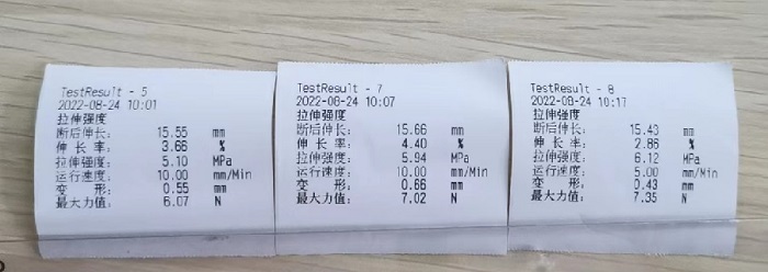 抗拉強(qiáng)度和斷裂伸長率的測(cè)試方法一般參照GB/T1040-2006《塑料拉伸性能的測(cè)定》:將膜劑裁切成5個(gè)長3cm,寬2cm的試樣,每個(gè)試樣采用MTL-500N智能電子拉力機(jī)縱向拉伸,選擇“拉伸強(qiáng)度”模式,拉伸速度為10mm/min,直至膜劑斷裂,如圖。儀器自動(dòng)計(jì)算抗拉強(qiáng)度和斷裂伸長率。